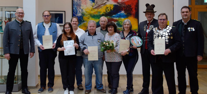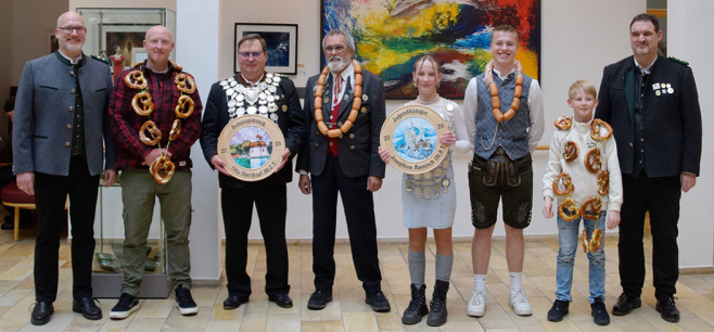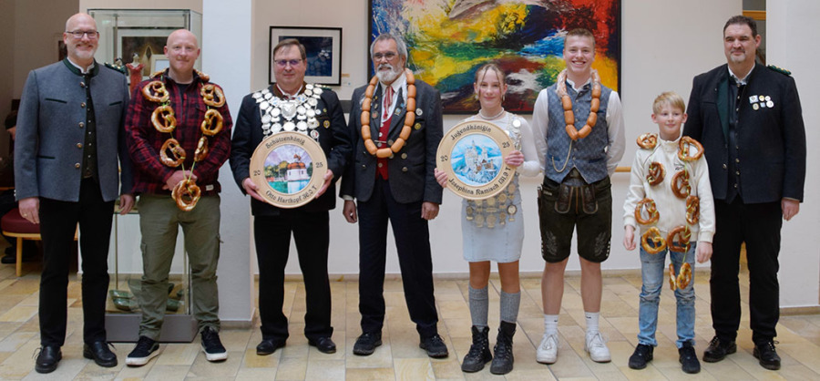 Von links nach rechts: Gerhard Zaum (40 J. Mitglied), Gerhard Lehmann jun. (Eröffnungsscheibe), Johanna Hartkopf (40 J. Mitglied), Olaf Kropp (25 J. Mitglied), Otto Hartkopf (Fahnenehrenzeichen), Chiara Pitzalis (Jugendwurstkönigin), Anton Kurz (Jubiläumsscheibe 111 J.), Peter Teufel (Fahnenehrenzeichen), Moritz Erlsbacher (1. Jugendkönig), Christian Schwarz (Brezenkönig), Karin Zander (Wurstkönigin), Sebastian Thaler (Bürgermeister), Valentina Pitzalis (Jugendbrezenkönigin), Lisa Forstner (Schützenkönigin), Gregor Liebe (1. Schützenmeister), Simon Kurz (65 J. Mitglied), Adolf Mayr (stv. Gauschützenmeister)