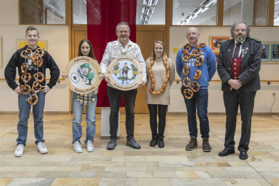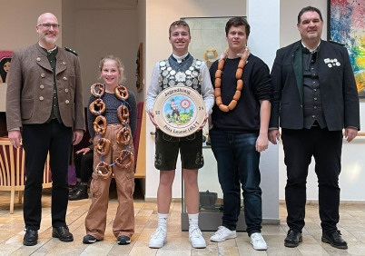 (Foto v.r.n.l.) Olaf Kropp (1. Schützenmeister), Jonas Ramisch (3. Jugend-König / "Breznkönig"), Felix Leuner (2. Jugend-Schützenkönig / "Wurstkönig"), Josephina Ramisch (1.